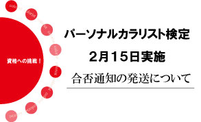 2月15日(月)実施の第46回パーソナルカラリスト検定の合否通知は、3月15日(月)に一斉発送発送予定です。 問い合わせ先 協会事務局☎03-34068708(平日9:30~18:00)